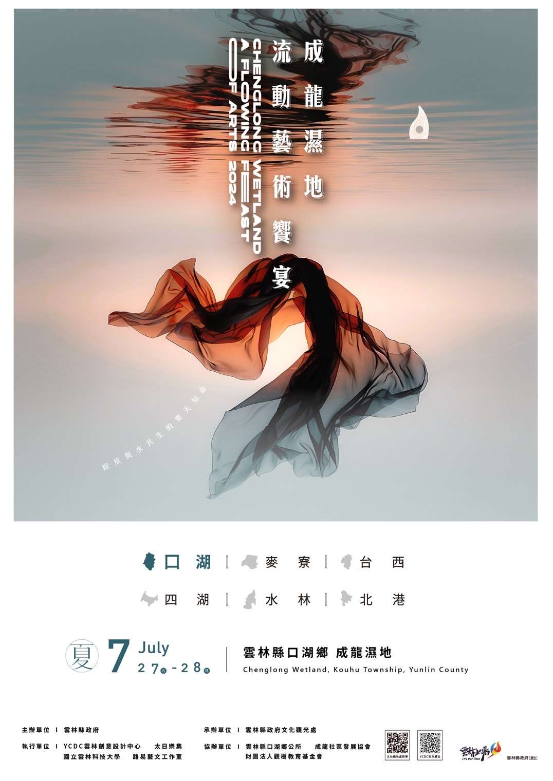 張縣長表示,本月27、 28日在成龍濕地舉辦的流動藝術饗宴,則由雲林太日樂集、森森不息街頭劇場─趙敦毅以及顧凌睿老師團隊柏齡太鼓共同演出《雲水之際》,表演選在夕陽西下的時刻進行,利用夕陽餘暉與濕地水面的倒影,讓夕陽餘暉與優柔舞藝呈現出一幅如詩如畫的自然景觀,讓觀眾感受雲西動人時刻。